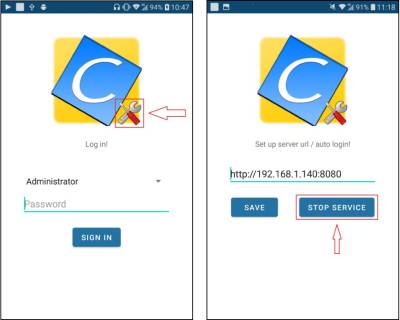 When logged in, pressing the physical / software back button on the device twice in succession logs out the currently logged in user. After pressing the wrench icon on the initial screen (left image), the client will be stopped by pressing the stop sevice button twice in succession on the screen (right image).